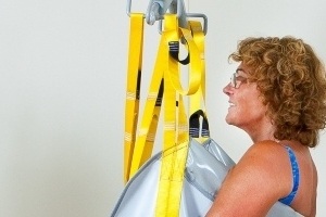 In het eerste geval spreek je van een “plafondlift met begeleiding” of een “2-functie plafondlift”. Deze 2 functies omvatten het stijgen en dalen. De horizontale beweging wordt uitgevoerd door de persoon naast je. hij of zij helpt je tevens veilig in de lift plaatsnemen. Aan de 2-functie lift hangt een met stevige banden bevestigde, flexibele zitting met ondersteuning voor je rug. Door deze zitting (met hulp) onder je door te schuiven en aan de banden te bevestigen kun je zowel vanuit liggende als zittende houding opgetild worden.